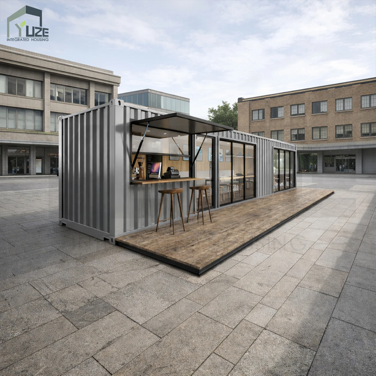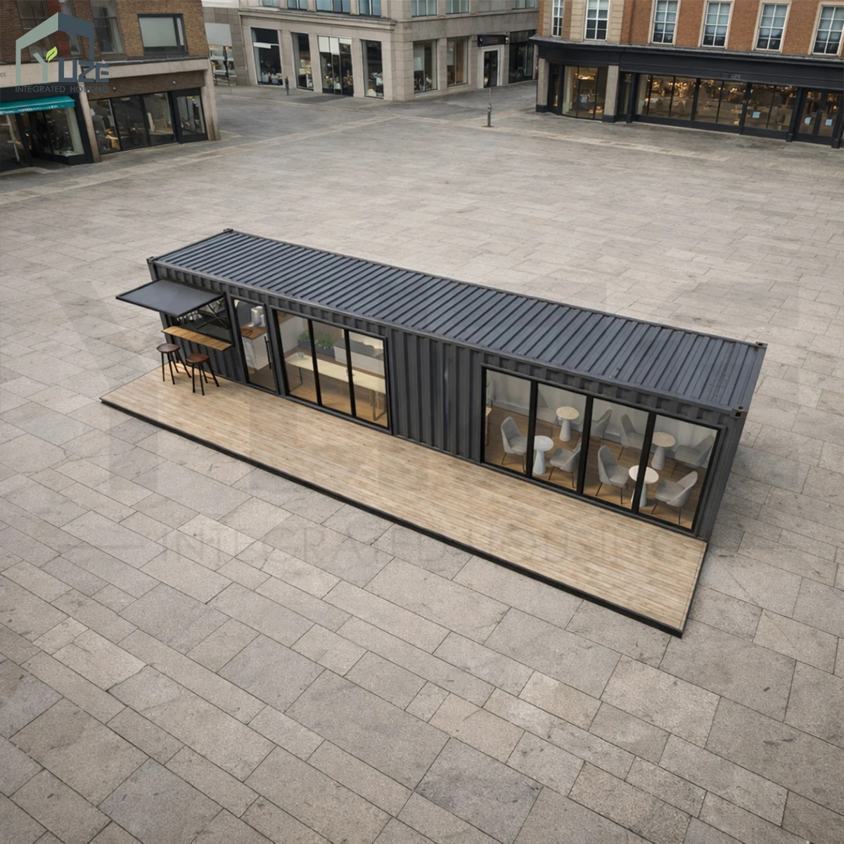 This container restaurant is built with a durable steel structure and a prefab modular system, designed specifically for commercial food business use.
